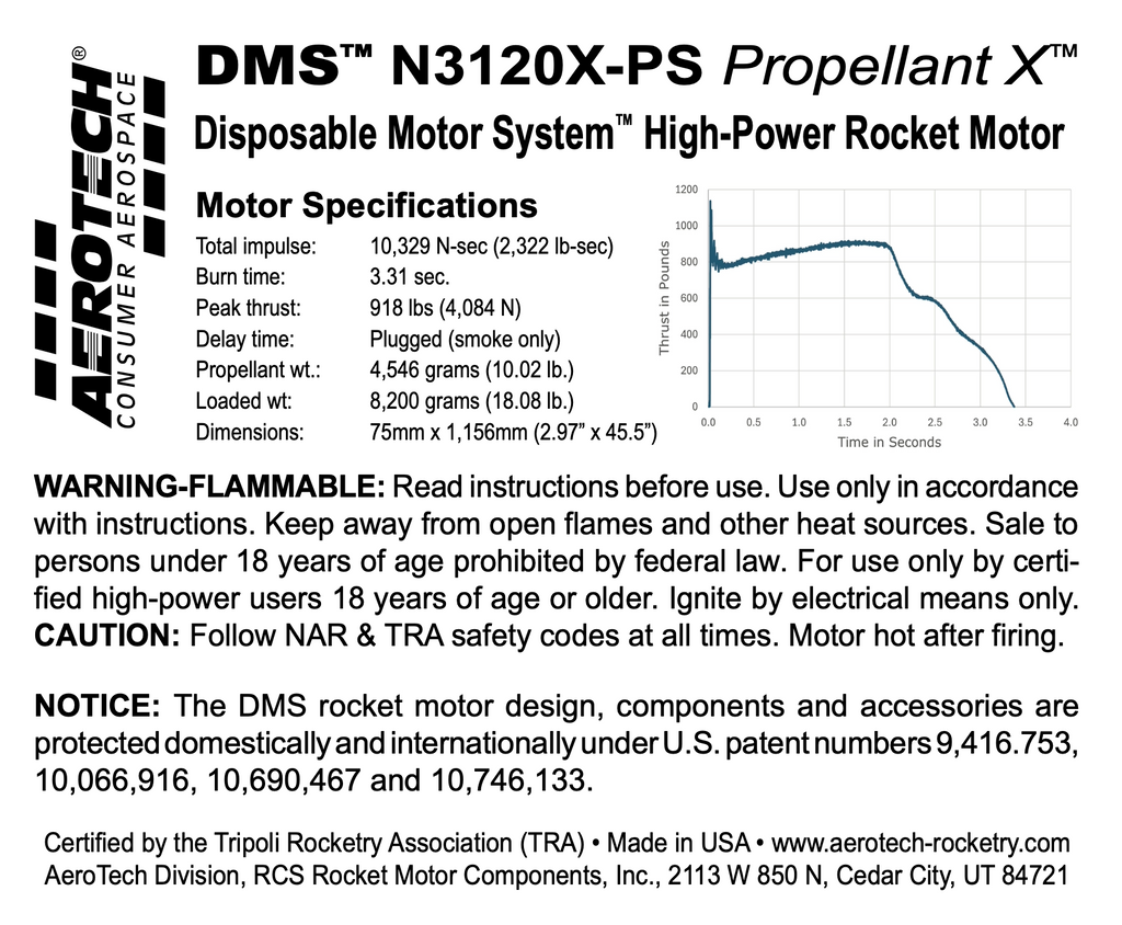 The N3120X-PS (P/N 14310P) motor uses AeroTech’s high-Isp Propellant X™ to produce an exceptionally high total impulse, accompanied by a bright white flame with a moderate amount of smoke. The motor delivers 10,329 N-sec (2,322 lb. sec) of total impulse in 3.3 seconds making it ideal for extreme high-altitude attempts (including two-stage flights to the edge of outer space!) and sport flights in heavy weight rockets. The N3120X-PS is a “plugged” motor that produces tracking smoke only, and cannot be configured with an integral ejection charge. Rockets using 75 and 98mm DMS motors must utilize an electronically-activated recovery system.