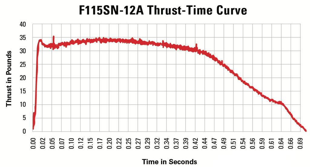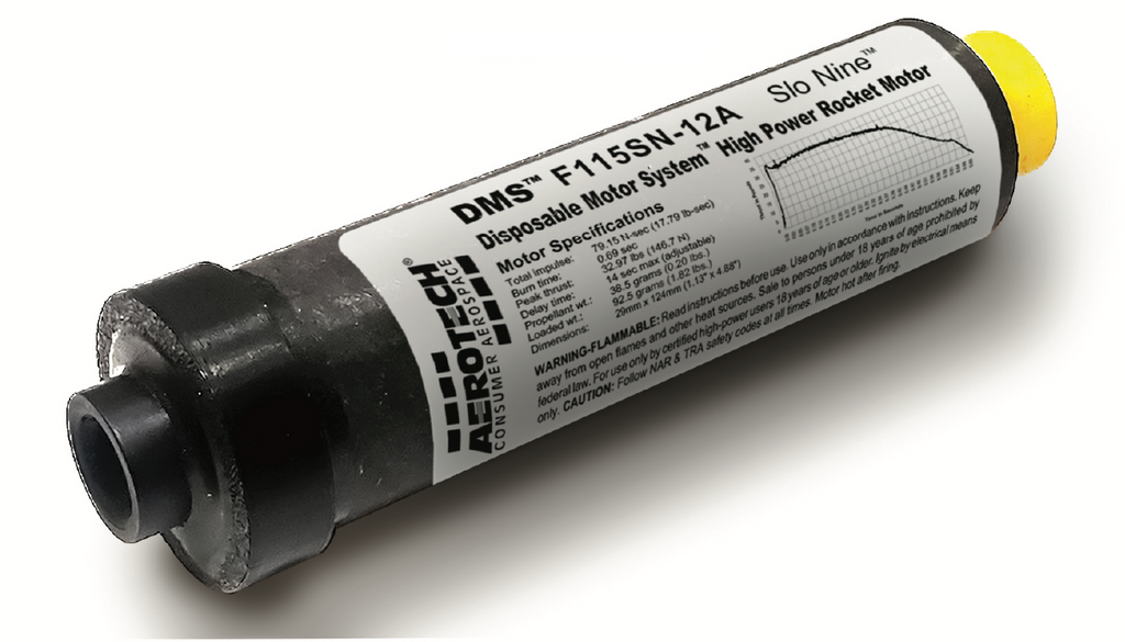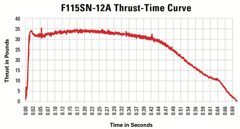 Priced at only $29.99 ea. SRP, this is AeroTech's first "F" Size DMS™ rocket motor and is a real bargain considering its high-power rocket potential. The new F115SN-12A is classified as a high-power hobby rocket motor as its average thrust exceeds 80 Newtons.